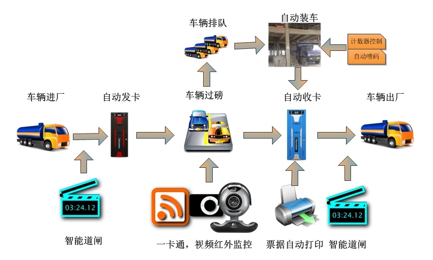整个系统贯穿于车辆进厂到车辆出厂,该系统使用一卡通销售系统和智能道闸规范车辆的物流路线,使用红外监控和视频监控实现对车辆过磅行为的控制和监督,使用ETC设备对卡片信息进行扫描,将所有数据都实时的读取到智能物流系统中。