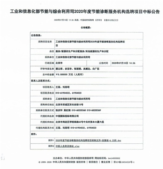 7月15日,我院在工信部节能与综合利用司2020年度节能诊断服务机构选聘项目中成功中标。这是我院继去年中标本项目后再次中标。